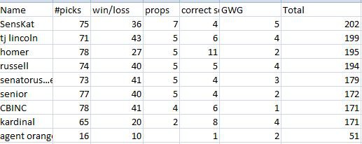 tjlincoln wrote:SensKat wrote:Cbinc wrote:two games update tonight...SensKat missed a pick..what happened to that one? (vs Dallas) My pick is there, I just missed the prop bet. It was all wrong... but it is there Oh my!!! 2 points back, clinging to Homer's coattails that 1 game paid off