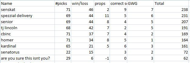 I "accidently" gave Senior a win/loss guess wrong...it will be updated after the next game.