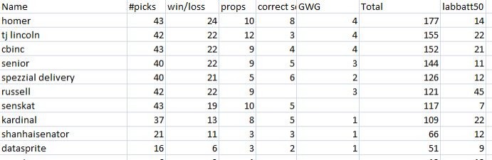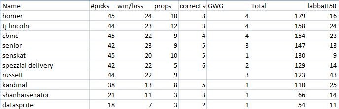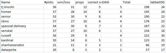 the House of Lancaster maintains the lead, but Spezzial Delivery got a GWG, and a correct score(different games)