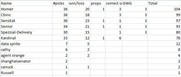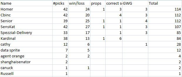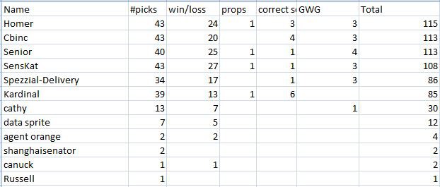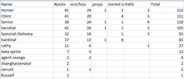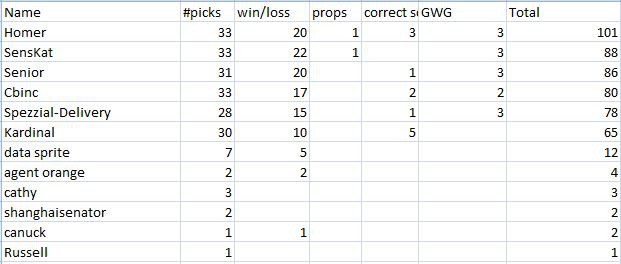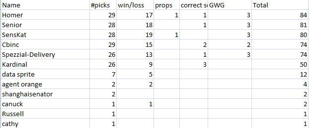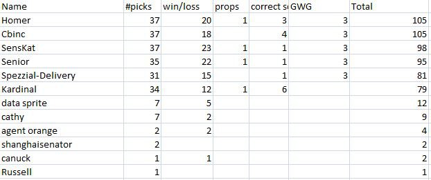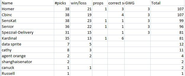 Cbinc wrote:SensKat wrote:I don't think I've missed predictions in 2 games? I DEFINITELY had one in last night's game thread.... I will look into it...sorry my Hufflepuff overlord...
