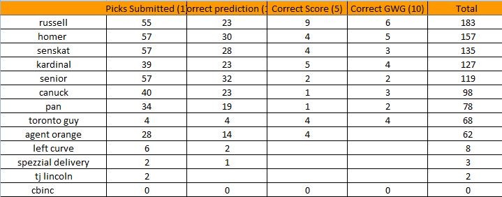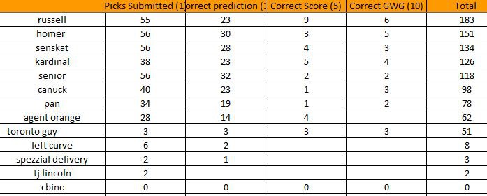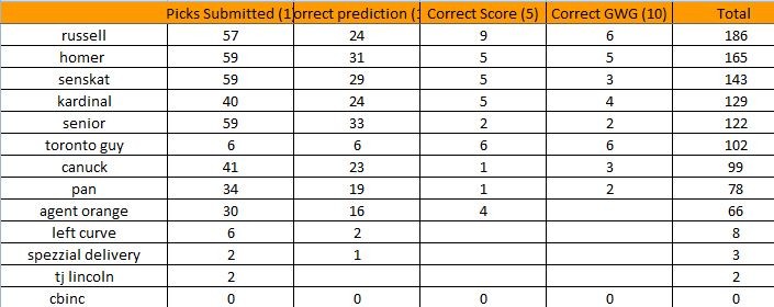 there has been a "slight" adjustment to the pool...I am under investigation for "hockey pool performance enhancing drugs", but I expect to be cleared of all wrong doing...I AM TAKING YOU DOWN WITH ME RUSSELL!