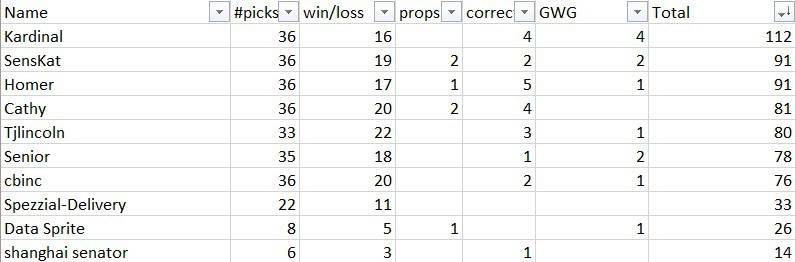 SensKat maintains the lead with a Props win! Senior got the GWG! Russell got a cat.