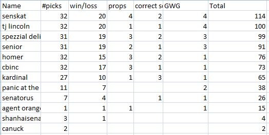 several people got the correct score...but Kat got the GWG(Kardinal too), and increases the lead!