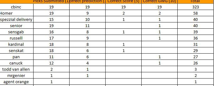 after game 11 vs Detroit cbinc=I AM WALKING AWAY WITH THIS ONE! homer=32 spezzial delivery=29 senior=28 canuck=20 weaselhater=15 senskat=15(beat the weasel hater with one more submission!) Kardinal=14 sensgab=12 pan=9 @heyitstva=3 mrgenier=2 agent orange=1
