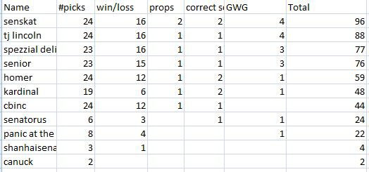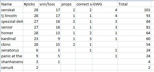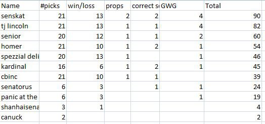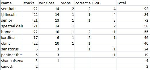 tjlincoln wrote:Cbinc wrote:No gimmicks eh?. Saturday, props bet.... First goal, last penalty, and does Chabot get a point? these are fun, not just on the last day like last year.