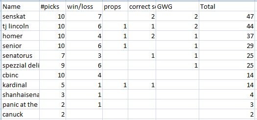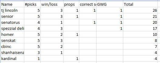 I forgot your pick Kardinal, but it will be updated after the next game.