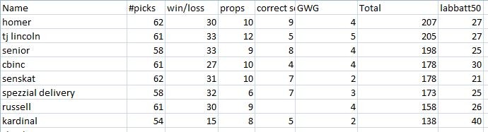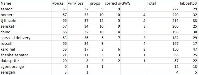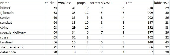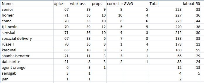 i got the GWg vs Nashville, but Senskat got it perfect, The House of Lancaster maintains a slight lead over Delta Tau Chi.